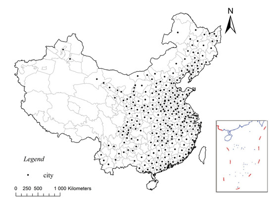 Due to rapid urbanization and administrative adjustment in China, the number of cities frequently changed in the past several decades [52]. To obtain a representative and fixed sample, we selected 285 cities at the prefecture level and above as the study area (Figure 1). In accordance with Riad et al. [48], cities differing in water endowment, economy, and size were included.