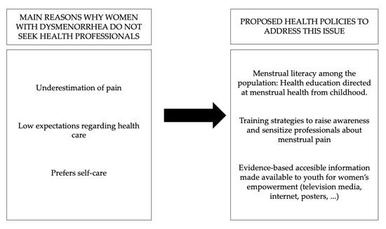 Main reasons why women with dysmenorrhea do not seek health consultations and proposed health policies to address this issue.
