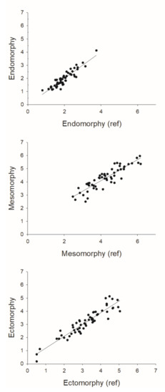 Scatterplot of the relationship between the somatotype components obtained by the reference method and the new formulas.
