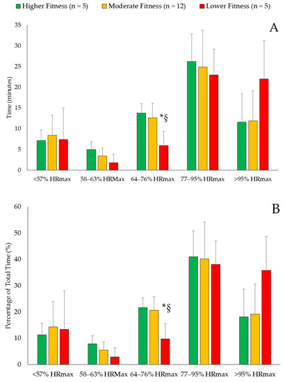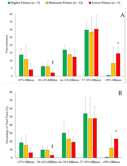 Figure 1. Time spent (A) and percentage of total time spent (B) in heart rate (HR) intensity zones defined by the American College of Sports Medicine [44] for higher fitness, moderate fitness, and lower fitness custody assistant recruits during circuit training session one. * Significantly (p < 0.05) different from the HF group. § Significantly (p < 0.05) different from the MF group.