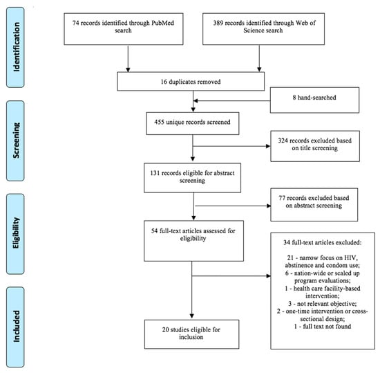 This review was limited to full-text original peer-reviewed articles published in English, between January 2009, the year when UNESCO’s International Technical Guidance on Sexuality Education was published [], and January 2019. Articles were excluded if they: (1) provided insufficient information, for example letters, abstracts or conference papers; (2) had a narrow focus on HIV-related knowledge and outcomes; (3) focused exclusively on abstinence approach to sexuality education without addressing broader topics such as contraception or other STIs; (4) evaluated only national or widely scaled-up programs, which may require more complex approach to evaluation influenced by a number of factors such as region, type of schools etc., and render its incomparable with small-scale interventions; and (5) implemented interventions exclusively in health care facilities without school or community components. Details of the study selection are summarized in Figure 1. Titles of the 455 studies and abstracts of 131 records were screened. Full texts of articles that passed the title/abstract stage were obtained for text screening.