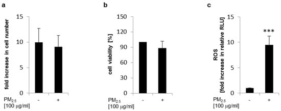 Long-term exposure to PM2.5 does not affect proliferation or cellular viability but increases intracellular reactive oxygen species (ROS). BEAS-2B cells were cultured in the presence of 100 µg/mL PM2.5 for three to five weeks as described in the materials and methods section. (a) Cells were detached by trypsin, analyzed by a trypan blue exclusion assay, and counted in a Neubauer counting chamber using a light microscope. Only viable cells were considered and were depicted as fold increase in cell number compared to plated cells (n = 3). (b) Cellular viability was determined by an MTT assay (n = 3). (c) For quantification of intracellular ROS, 2′,7′-dichlorofluorescein diacetate (DCFH-DA) labeled cells were analyzed by flow cytometry (n = 3). Cells cultured in the absence of PM2.5 served as controls. Values are depicted as means and +standard deviations; *** p < 0.001.