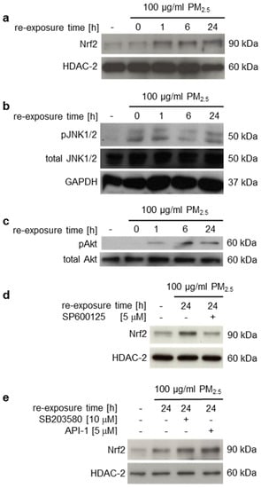 The MAPK p38, JNK1/2, or PI3K/Akt pathways may be involved in the activation of Nrf2 [,]. Previously, we described a p38-mediated stress response to PM2.5 from biomass combustion []. Here we additionally show phosphorylation and thus activation of JNK1/2 and Akt by long-term exposure to PM2.5 (Figure 2b,c). To clarify whether these kinases affect PM2.5-dependent nuclear translocation of Nrf2, specific kinase inhibitors were utilized. Immunoblots of nuclear extracts from PM2.5-exposed cells demonstrated that Nrf2 translocation was prevented by the JNK1/2 inhibitor SP600125, but not SB203580 (p38 inhibitor) or API-2 (Akt inhibitor) (Figure 2d,e).