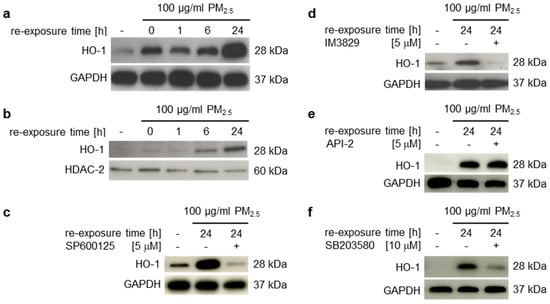 HO-1 has emerged as an important phase II detoxifying and anti-oxidative enzyme that is highly upregulated by oxidative stress and is transcriptionally regulated by Nrf2 []. To investigate whether nuclear accumulation of Nrf2 is accompanied by an increase of its downstream target genes, HO-1 protein levels were determined in crude total cell lysates or nuclear extracts by immunoblotting (Figure 3a,b). HO-1 was significantly upregulated in human bronchial epithelial BEAS-2B cells in the presence of PM2.5, but also when particles were removed for 24 h from long-term exposed cells (Figure 3a, lane 2). Nuclear translocation was most strongly detectable in the presence of PM2.5 after 24 h of re-exposure (Figure 3b). Inhibitors for JNK1/2 (SP600125) or Nrf2 (IM3829) prevented HO-1 expression (Figure 3c,d), confirming a JNK1/2-Nrf2-dependent pathway of HO-1 transcriptional activation by PM2.5. The Akt inhibitor API-2 had no impact on HO-1 expression, whereas the p38 inhibitor SB203580 partly decreased the PM2.5-dependent HO-1 induction (Figure 3e,f). This suggests that an additional mechanism of p38 mediated HO-1 upregulation by fuelwood emissions.