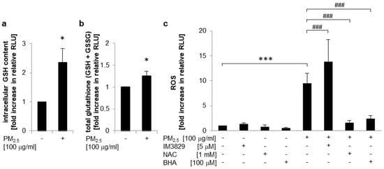 Nrf2 plays a pivotal role as a transcriptional regulator of genes encoding for enzymes that are involved in the formation of glutathione []. Reduced glutathione (GSH) is the most abundant thiol antioxidant in mammals and a key factor for reducing reactive species, maintaining redox status, and inhibiting apoptosis [,]. To analyze whether PM2.5-dependent Nrf2 activation is linked to increased intracellular GSH levels, a glutathione fluorometric assay was performed (Figure 4a). Exposure to PM2.5 markedly increased both intracellular GSH content (Figure 4a) and total GSH (including GSSG) levels (Figure 4b), indicating that overexpression of GCLC (Table 1) by Nrf2 might increase bioavailability of GSH. At the same time, ROS generation by PM2.5 was restricted by a Nrf2-mediated pathway and dependent on the cellular anti-oxidative capacity as demonstrated by DCFH-DA labeling of BEAS-2B cells (Figure 4c). In PM2.5-exposed cells intracellular ROS generation was significantly increased upon inhibition of Nrf2 by IM3829, but was almost completely blocked in the presence of antioxidant compounds, such as N-acetylcysteine (NAC) or butylated hydroxyanisole (BHA). The inhibitors used had no effect on ROS generation in the absence of PM2.5. These observations suggest that PM2.5-mediated oxidative stress is limited by a Nrf2-dependent mechanism.