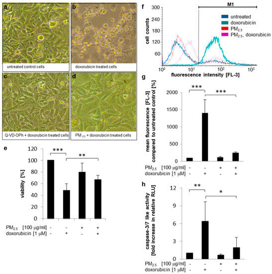 Cell death resistance to doxorubicin mediated by PM2.5. BEAS-2B cells were cultured in the presence of 100 µg/mL PM2.5 for 3 to 5 weeks, before final passage and re-exposure of cells to 100 µg/mL PM2.5 for 48 h. Q-VD-OPh (10 µM) or API-2 (5 µM) were added 1 h prior to the last PM2.5 exposure, doxorubicin (1 µM) was added 24 h after the last addition of PM2.5. Equally cultured cells that were never exposed to PM2.5 served as controls. (a–d) Photomicrographs of BEAS-2B cells. (e) Cell viability determination by an MTT assay (n = 3. (f,g) Quantification of the intracellular doxorubicin content by flow cytometry. In (f), a representative histogram is shown using the FL3 detector, (g) depicts mean fluorescence values (FL3) compared to untreated cells (n = 4). M1: gated region for measurement of mean fluorescence. (h), detection of apoptosis by a caspase 3/7 activity assay (n = 6). RLU: relative light units. Values are depicted as means and +standard deviations; * p < 0.05; ** p < 0.01; *** p < 0.001.