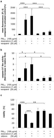 Increased efflux of chemotherapeutic agents may be related to the elevated expression of drug efflux transporters []. The ABCB1-encoded multidrug transporter P-glycoprotein (P-gp/MDR1) has been described as a target for Nrf2 regulation and uses doxorubicin as a substrate [,]. However, verapamil, a competitive substrate for P-gp [], had only a slight, but not significant influence on intracellular doxorubicin levels (Figure 6a and Figure S3a) and the induction of apoptosis (Figure 6b). Additionally, a second P-gp inhibitor (silibinin, []) was utilized to analyze doxorubicin resistance in PM2.5-exposed cells by a cell viability assay (Figure 6c). Again, cell viability was not significantly reduced by doxorubicin in PM2.5-exposed cells (Figure 5e and Figure 6c). Inhibition of P-gp by silibinin only marginally affected the viability of particle-exposed cells (Figure 6c, compare bars 5 and 6), whereas in cells that were never exposed to PM2.5, silibinin further enhanced the reduction in cell viability by doxorubicin (Figure 6c, compare bars 2 and 3). These results suggest that P-gp may not be involved in PM2.5-mediated doxorubicin resistance.