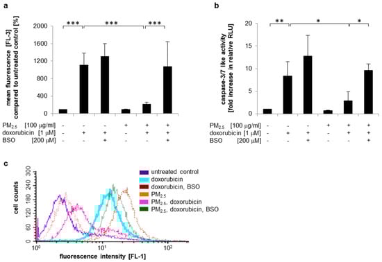 GSH can modulate the efficacy of anti-tumor agents by direct chemical interaction either with the drug or ROS formed as a result of drug activation []. We observed both increased intracellular GSH levels (Figure 4a,b) and upregulation of the drug efflux transporter MRP2, which uses GSH-conjugates as a substrate (Table S5). To analyze whether increased bioavailability of GSH is involved in PM2.5 induced doxorubicin resistance, intracellular GSH formation was inhibited by BSO, which is known to block glutamate cysteine ligase-dependent GSH synthesis []. Subsequently, intracellular accumulation of doxorubicin and the induction of apoptosis were compared in PM2.5-exposed cells and controls (Figure 7 and Figure S3b). Similar to our previous observations, cells that were never pre-exposed to PM2.5 readily accumulated doxorubicin (Figure 7a and Figure S3b), exhibited strong caspase-3/7 activity (Figure 7b), and displayed loss of membrane asymmetry as visualized by Annexin V binding (Figure 7c). In contrast, PM2.5-exposed cells showed a low doxorubicin content and resistance to doxorubicin-mediated apoptosis. Treatment with BSO-abrogated cellular efflux of doxorubicin and increased doxorubicin-mediated caspase activity to levels comparable to those of control cells that were never exposed to PM2.5. BSO also prevented the PM2.5-mediated stabilization of membrane asymmetry in the presence of doxorubicin. In conclusion, these results indicate that increased bioavailability of GSH is involved in PM2.5-mediated chemoresistance.