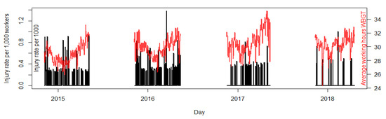 Estimated daily total recorded occupational injury rate per 1000 sugarcane harvesters with daily WBGTmean temperatures for the 2014–2015 harvest with the assumption of an average of 6 tons of sugarcane harvested per day.