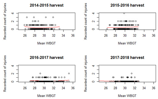 Previous studies examining the association between WBGT and health outcomes have suggested that the appropriate functional form may take on a U-shape or other non-linear relationship indicating that both extreme cold and extreme heat are risk factors for morbidity and mortality [31]. Given the WBGT ranges observed in Central America [25], extreme cold is not a concern currently in this population. Nevertheless, we assessed correlation plots between WBGT and reported count of injuries and fit a smoothed spline for each of the four harvests independently to understand if similar non-linear trends were present at the extreme temperatures experienced by our study population.