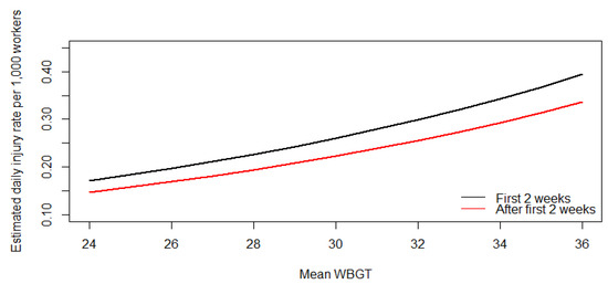 In this study, we established that the risk of recorded occupational injury increases 3% for each degree increase in average daily mean WBGT above 30 °C. This is in line with the study by Sheng and colleagues which estimated that risk of occupational injury, regardless of industry, increased 1.4% for each degree increase in daily maximum temperature and 1.7% for each degree increase in daily minimum temperature [35]. The average daily maximum temperature in the Sheng study was 32 °C with the average minimum of 24 °C. The differences in increased risk are unsurprising given agricultural workers have been found to have excess risk of experiencing occupational injury in light of increasing temperatures [36,37].