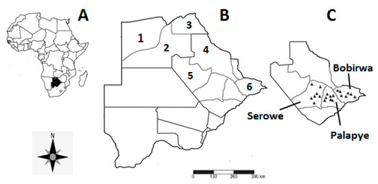 Map showing (A) the location of Botswana within Africa, (B) the malaria endemic sub-districts and the study site in Botswana, and (C) surveyed villages of the Central district; Serowe, Palapye and Bobirwa sub-districts. 1 = Okavango, 2 = Ngamiland, 3 = Chobe, 4 = Tutume, 5 = Boteti, 6 = Bobirwa.