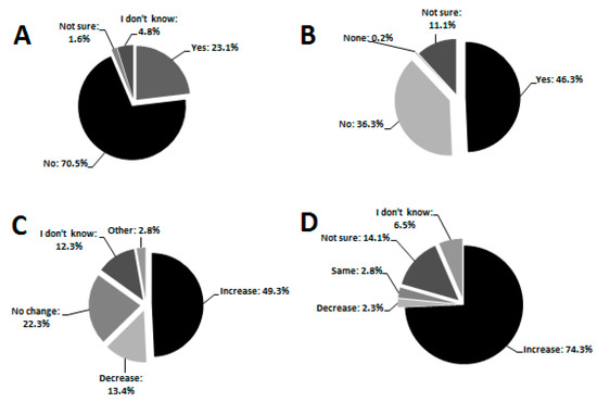 The majority of the respondents (49.3%) perceived mosquito abundance to be increasing over the last 10 years (Figure 3C), particularly during summer when temperatures were very high (90.5%). Some responders reported that mosquitoes were present regardless of temperature (6.5%), whilst others were either not sure (1.1%) or did not know (0.5%) about mosquito population trends within their localities. Similarly, the majority identified temperature as the main contributing factor to mosquito proliferation (35.9%).