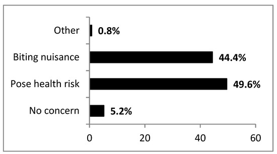 A significant proportion of respondents (49.6%) perceived mosquitoes as health risks to the community; 44.4% considered them to be just a biting nuisance while some (5.2%) were not concerned with mosquitoes at all (Figure 4).