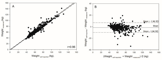 We observed a dose–response relationship in the discrepancy between self-reported and measured weight with body weight (p < 0.0001 for weight). Figure 1B (Bland–Altman plot) illustrates the difference between self-reported and measured weight in relation to the mean of both values indicating that girls with higher weight tend to underreport while girls with lower weight or BMI tend to overreport.