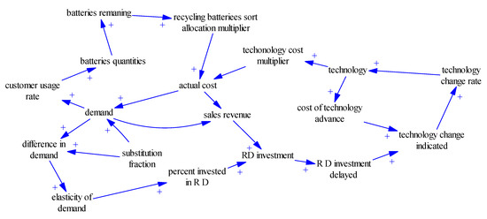Based on the previous model assumptions for specific situations, we analyse the causal relationship in the recovery of power batteries of companies. The subject of this study is the optimisation and driving mechanism in the process of the recycling, processing, and reprocessing of waste power batteries in a company and the development of a company operation system. The boundary of the study involves relevant entities and important variables in the business process. By investigating and analysing the recycling system, specifically, in company recycling departments, sorting and processing departments, manufacturing and production departments and marketing departments and customers under this closed-loop system, firstly, we determine the influence of battery substitutes on the system. Customers’ diverse demands and substitutes’ attractiveness are factors that companies cannot control directly, whereas controllable factors include customer satisfaction, customer brand preference and customers’ perceived barriers to change [32]. At the same time, the economics of company and environmental performance is influenced by active environmental behaviours and innovative technology. To optimise companies’ economic and environmental benefits, firstly, we must ensure that companies engage in scientific, rational, and active positive environmental behaviours and have a wide range of technological innovation. The embodiment of companies’ benefits experiences cycle delays and the scale economy; thus, the corresponding active environmental behaviours and technological innovation also possess such properties. Therefore, technological innovation research support from different sectors can effectively improve companies’ economic and environmental performance. Fund support can also directly improve the efficiency and economic benefits of the system. Thus, through the adoption of the company power battery recycling system to identify indicators among the various factors as well as causal relationships, a causal graph is drawn as follows in Figure 2.
