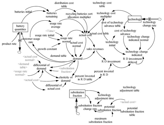 However, most studies on the input supply chain structure are static analyses and do not reflect the passive battery consumption situation. Conducting research on a recycling subject and the incentives of an enterprise strategy is difficult. As a dynamic company behaviour with multiple subjects, diverse influencing factors and complex relationships, battery recycling must adopt the system dynamics method to accurately reflect the specific battery recycling process. System dynamics is often used in business decision making, waste management, industrial engineering management and other fields. It can effectively address the effect of policy implementation and the nonlinear structure of realistic assumptions. Moreover, system dynamics can understand the complex relationships among different elements from a holistic perspective, predict dynamic feedback from historical dimensions and make predictions using model boundary, structure, and parameter adjustments to optimise a model. From the overall perspective of a company, the system dynamics research method is an effective way to resolve the system driving problem as a whole. Previously, scholars used system dynamics to study the recycling of waste power batteries. Hou constructed a system dynamics model for added electric vehicle amounts based on an analysis on the relationship between power batteries and electric vehicles. The author predicted the addition of electric vehicles in the future and calculated the new power battery increment [27]. Wang Lili analysed the internal recycling and remanufacturing behaviours of companies in the used battery reverse supply chain system and employed system dynamics and cognitive behaviour theory based on planning behaviour theory to examine the impact of relevant social factors on consumers’ acceptance of remanufactured batteries. In addition, the author analyzes it from the perspective of consumer behaviour and drew on the strategies of companies’ recycling and remanufacturing capacity in different situations. Meanwhile, the government and battery companies should encourage and guide consumers to use remanufactured batteries in the early stage [28]. However, the present study focuses on choices from the consumer side and does not comprehensively examine the overall perspective of a company. With technological innovation creating recycling innovation and product replacements, the power battery processing and reuse process has improved. Companies’ recycling and reprocessing of waste power batteries involve a complex, dynamic, and nonlinear process. Moreover, revealing the internal laws and influences of factor changes on the overall model using a conventional analysis method is difficult. Based on this assessment, this study uses the system dynamics method to analyse these complex processes and their impact and department system internal factor mechanism operations.
