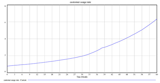 The initial usage rate is set to 0.8 in the initial setting, and the real rate value is changed when the value of the initial usage rate is changed. Given that the usage rate changes according to the value of the other variables and company benefits, we can analyse the influence of the actual usage rate variable on the other factors.