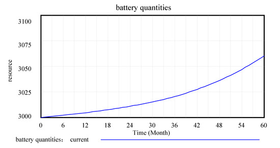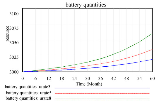 Figure 4, Figure 5 and Figure 6 are the intuitive responses to the basic variables and the variables we mainly observe, that is, the intuitive result presentation of the simulation results. Technology change indicated normal is 0.1, and the maximum substitution fraction is 0.6 under the condition of initial value technological innovation investment and alternative parameter control, considering that in 60 simulation cycles, the number and recovery rate of spent power batteries are significantly increased by the company recovery system from the initial 3000 units to over 3060 units. This result is in line with the improvement of technological innovation in the development of companies, which inevitably anticipates the increase in the number of batteries. At the same time, the consumer consumption rate for power battery products also increases significantly, and a certain degree of fluctuation in the set cycle is observed, which is in line with the expectation of innovation technology investment for the promotion of a company. This is a good driving force for new energy battery recycling enterprises in the current big environment, such as the substantial reduction in profits, lack of core technology, excess capacity, and recycling difficulties [33].