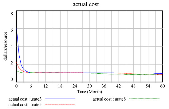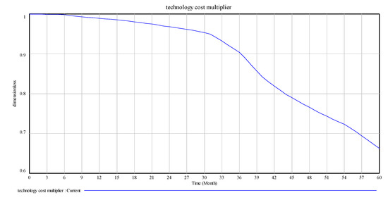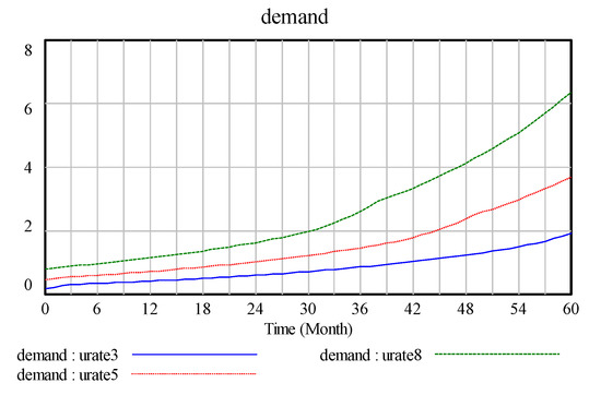 Figure 13 and Figure 14 show changes in the technology stock and alternatives stock as a result of the initial change in the usage rate. Owing to the complexity and linkage of system dynamics, changes in the usage rate must be driven by technological innovation to increase demand. Under the condition of a high technology stock, the corresponding factors are a high recycling rate and a low product substitution rate. Figure 15 shows actual cost. In the battery recovery cost, the commonly believed cost includes initial investment costs, operation and maintenance costs and batteries replacement costs [34]. The factors in the system complement one another owing to technological innovation. The change in technological innovation capability has little effect on the change in actual expenditure. Moreover, the process of improving the reuse rate by improving the innovation capability of a company promotes the technological innovation, product recycling and manufacturing departments among the other systems, thereby enabling the company to experience increased product demand and gain substantial benefits.