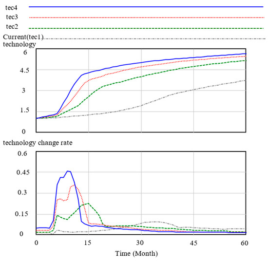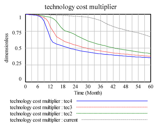 The Figure 7 represent current(tec1), tec2, tec3, and tec4 corresponding to 0.1, 0.4, 0.7, and 1 technology change indicated normal, respectively. Changes in technology change indicated normal mainly generate the peak value of the technology change rate, and the higher the peak value, the higher the change rate. In Figure 8, the change in the technology impact multiplier is a high technology change indicated normal, and the effect on the technology multiplier is rapid and obvious. However, a low technology change indicated normal is a slow process and takes a long time to accumulate the effect of technological input on the final cost.