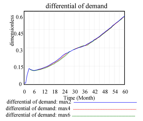 In the Figure 9, max2, max4, and max6 show the partial effect on the alternatives when the maximum substitution fraction is equal to 0.2, 0.4, and 0.6, respectively. In this study, the waste power recovery system of a company examines current power battery replacement products. The system simulation determines that the proportion of the replacement is only 0.1 or less, which is in line with power batteries as a source of new energy in the current automotive industry development trend. In addition, with technological innovation investment factors, the substitution trend decreases and stabilises. With the limitation in the maximum substitution fraction, the change rate of the substitution fraction does not increase much and returns to the original level in 30-unit cycles. Thus, the maximum value of the maximum substitution fraction is limited by external means, such as technological innovation. Figure 10 shows the improvement in the maximum substitution fraction has little effect on the differentiation of the requirements.