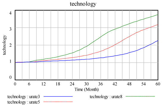 In the research of the closed-loop technological innovation subsystem, technology change rate → technology innovation stock → technology cost maturity → actual expenditure → sales revenue → technology R&D investment → technology R&D delay → technology potential change → technology change rate. In the system dynamics model, the initial technology investment improves the technological innovation change rate; thus, technology stock investment increases significantly. In addition, owing to technological improvement, the technology cost multiplier correspondingly reduces the actual expenditure of a company and promotes its development towards an improved direction. Therefore, technological innovation capability, as the key factor driving companies’ development, must pay attention to the initial technology stock in the operation of a company and alter the change rate of technological innovation simultaneously and make timely changes according to the current technological environment to improve drive.