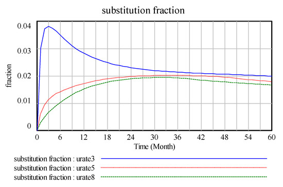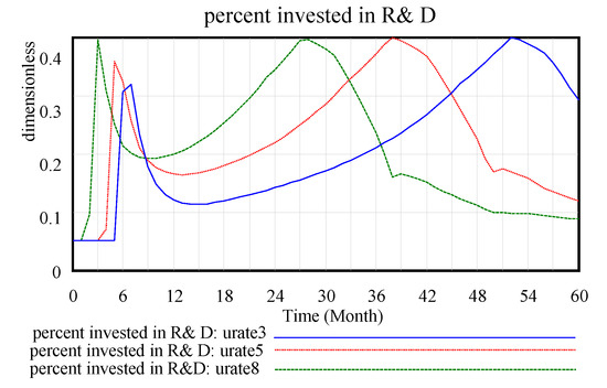In the case of the initial usage rate, the change in the rate of investment in technological innovation over the dynamic process is shown in Figure 16. As the rate changes from 0.8 to 0.5 to 0.3, the curve of percent invested in R&D moves to the right. That is, the technological innovation investment time is more delayed than expected, and this time delay indicates that a company’s response to technological innovation investment is also slow under the condition of a low recycling rate. For large usage rate images, the image duration is less than the smaller usage rate image fluctuation range. This change indicates that technological innovation investment requires less time under a high recycling utilisation rate, and a stable high rate requires a high technological innovation input rate.