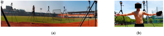 The experimental instrument setting (a) cameras setup of the motion capture system in the baseball stadium and (b) locations of markers attachments on the subject.