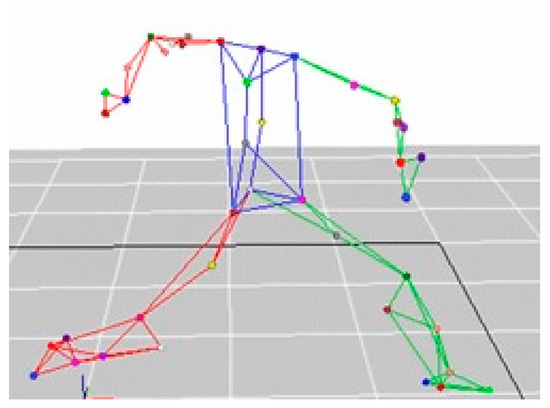 The distance between the mound and the home plate was set to the standard distance of 18.44 m. A professional umpire standing behind the catcher identified each pitch as a ball or a strike. The pitching motion was captured at a sampling frequency of 300 Hz using a motion analysis system consisting of eight CCD cameras (Eagle System, Motion Analysis Corporation, Santa Rosa, CA, USA) arranged around the pitching mound (Figure 1a). To evaluate the kinematics during the pitching motion, 18 passive markers with reflective stickers (12 mm diameter, Motion Analysis Corporation, Santa Rosa, CA, USA) were attached by trained researchers and using surgical tape (Micropore™, 3M company, Maplewood, MN, USA) to fix on the subjects’ anatomical positions to estimate the joint centers and three-dimensional body-segment locations [18]. The reflective markers were attached on the seventh cervical vertebra, eighth thoracic vertebra, sternum, xiphoid process, marker triad on the right humerus, acromion, lateral epicondyle, medial epicondyle, radius, radial styloid process, ulnar styloid process, third metacarpal bone, and bilateral anterior superior iliac spine and posterior superior iliac spine (Figure 1b). Cortex 2.6 software (Motion Analysis Corporation, Santa Rosa, CA, USA) in the motion analysis system was able to identify the marker’s three-dimensional positions (Figure 2). On completion of the pitching trials, the fastest 5 of the 15 strike pitches thrown by each pitcher were taken for data analysis purposes. Moreover, if ball speed was below 10% of the first five ball speed and pitcher’s Borg’s Rating of Perceived Exertion Scale (RPE, 4–20) [2] was above 11, the pitcher was regarded as tired.