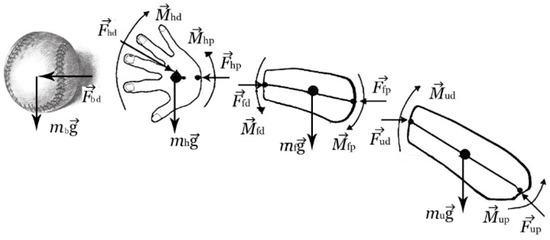 Free body diagram analysis of ball, hand, forearm and upper arm (Fp is the proximal end joint force; Fd is the distal end joint force; mg is the gravity force; Mp is the proximal end joint moment; Md is the distal end joint moment; u is upper arm; f is forearm; h is hand).