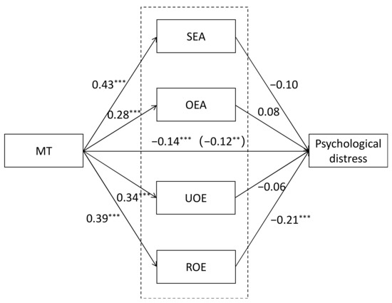 Multiple mediator model examining the direct and indirect relation of MT and psychological distress. Numbers in parentheses represent indirect effects. Note: all regression coefficients are standardized. SEA, ROE, UOE and OEA are the subscales of the Wong Law Emotional Intelligence Scale. ** p < 0.01.
