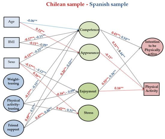 Concerning these goals, it was hypothesized that: (a) weight and PA teasing would negatively influence perceived competence, appearance, and enjoyment, and they would positively influence stress; (b) friend support would positively influence perceived competence, appearance, and enjoyment, and it would negatively influence stress; (c) perceived competence, appearance, and enjoyment would positively affect PA and intention to be physically active, and stress would affect them negatively; (d) country differences in the paths would be found when conducting multi-group analysis; (e) weight and PA teasing would act similarly in Chilean and Spanish samples.