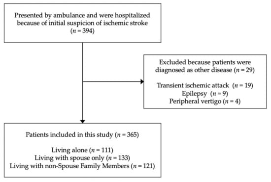 From April 2014 to February 2019, 394 patients were presented by ambulance and were hospitalized because of initial suspicion of an ischemic stroke. However, 29 patients were excluded because their diagnosis turned out to be a different disease: 19 cases of transient ischemic attack, six cases of epilepsy, and four cases of peripheral vertigo. Finally, a total of 365 patients (238 (65%) male, median age: 74 years, interquartile range (IQR): 63–82 years) were enrolled in this study (Figure 1). A comparison of the patients’ characteristics between the three groups (ALONE, SPOUSE, and OTHERs) is shown in Table 1. The majority of patients in OTHERs group were living with either one or two family member(s), while a minority were living with three family members. The patients in the OTHERs group were living with a son (43%) and/or daughter (49%), with a spouse (40%) or without a spouse (60%). The proportion of males was highest in the SPOUSE group. The patients in the OTHERs group had worse mRS scores before the stroke onset. Cardiogenic embolism was observed more frequently in the ALONE group (34 (30.6%)) than in the OTHERs group (22 (18.2%); OR: 1.99, 95% CI: 1.03–3.86). No other differences were seen between the groups in the other factors, including the proportion of wake-up strokes, NIHSS score at admission, tPA use, and the implementation of a mechanical thrombectomy.