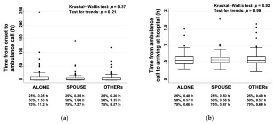 Cohabiting family members and the time from stroke onset to hospital admission: (a) time from the onset to the ambulance call and (b) time from the ambulance call to arriving at the hospital.