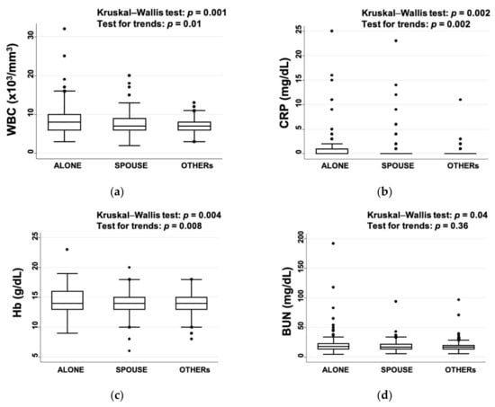 The WBC, CRP, and Hb values measured at admission were the highest in the ALONE group, followed by the SPOUSE and OTHERs groups (Figure 3). The NIHSS scores at admission were significantly positively associated with WBC (p < 0.001) and CRP (p = 0.01), but not with any other factors. On the other hand, the TP, Alb, BUN, and Cr values were not significantly different between the three groups based on the Kruskal–Wallis test for trends.