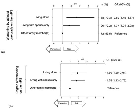 In total, 17 (4.7%) patients died after admission. The risk of death was higher in the ALONE group (9 (8.1%)) than in the OTHERs group (2 (1.7%); RR: 0.20, 95% CI: 0.05–0.92), but not significantly different compared with the SPOUSE group (6 (4.5%)). In total, 109 (29.9%) patients were discharged from the hospital without a reduction in the mRS score; in other words, the mRS scores were worse by at least one grade at discharge in the other 256 (70.1%) patients. The primary outcome, i.e., worsening by at least one grade on the mRS, was seen in 88 (79.3%) patients in the ALONE group and 96 (72.2%) in the SPOUSE group, both of which were significantly higher compared with the 72 (59.5%) in the OTHERs group (Figure 4a). Regarding the secondary outcome, i.e., the degree of worsening on the mRS, patients in the ALONE (OR: 1.90, 95% CI: 1.20–3.01) and SPOUSE groups (OR: 1.76, 95% CI: 1.13–2.75) showed significantly greater worsening than those in the OTHERs group (Figure 4b).