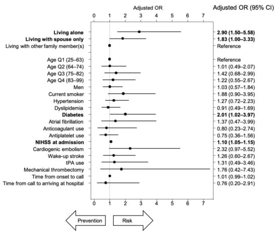 - Reeves, M.J.; Prager, M.; Fang, J.; Stamplecoski, M.; Kapral, M.K. Impact of living alone on the care and outcomes of patients with acute stroke. Stroke 2014, 45, 3083–3085. [Google Scholar] [CrossRef] [PubMed]