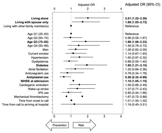 Even after adjusting with 19 variables, the risk of worsening by at least one grade on the mRS was significantly higher in the ALONE (OR: 2.90, 95% CI: 1.50–5.58) and SPOUSE groups (OR: 1.83, 95% CI: 1.00–3.33) than in the OTHERs group (Figure 5). In a multi-logistic regression model, having diabetes and the NIHSS score at admission were also identified as significant risk factors. Even after adjusting with the same 19 variables, the degree of worsening on the mRS was also significantly more prevalent in the ALONE (OR: 2.01, 95% CI: 1.22–3.30) and SPOUSE groups (OR: 1.69, 95% CI: 1.05–2.73) than in the OTHERs group (Figure 6). In the multi-logistic regression model, age quartile 3, having diabetes, and the NIHSS score at admission were also identified as significant risk factors, whereas antiplatelet use was found to be a protective factor.