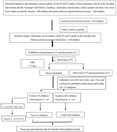 In the second stage, the result (outcome) of the related variable measurement in the first stage had two conditions, which were children identified as having DEC and children identified as not having DEC in their stools. Therefore, in the second stage, the children who were identified as being positive for the presence of DEC in their stools were the case sample, while children who were identified as being negative for the presence of DEC in their stools were the control sample. The flow of the research process can be seen in Figure 1.
