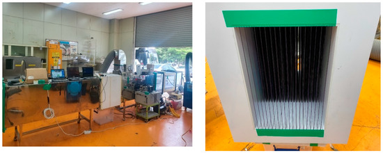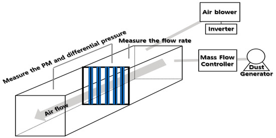 The reactor (Anytech Co., Suwon, Korea) and test specimen used to evaluate the A1 ultrafine test dust removal efficiency of the ACF are shown in Figure 2. Using a dust generator, A1 ultrafine test dust was sprayed into the reactor. The reactor measures the fine PM concentration according to location, and analyzes fine PM propagation according to wind speed; it can reproduce wind speeds of 0–30 m/s, and allows the user to vary duct length and sample the PM concentration in the duct.