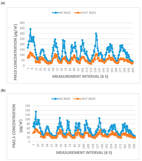 In a previous study that examined a slit-type paneled ventilated fence design, the NO and NO2 removal efficiency rates were significantly different versus without wind [15]. However, in the present study, filtration efficiency was examined using a vertical panel to remove any effect of differences in efficiency between the top and bottom of the panel. In that study [15], NO and NO2 removal efficiency rates were compared at wind speeds of 0.5 and 1.0 m/s, and NO removal efficiency was found to increase as wind speed decreased; at low wind speeds, NOx removal was promoted by adsorption and oxidation reactions. By contrast, in the present study, it targeted fine PM and observed high fine PM removal efficiency at moderate wind speeds of about 3.0 m/s. It may be that large amounts of fine PM are unable to reach the filter at low wind speeds, and that PM is not easily adsorbed at high wind speeds. The wind speed is a major factor in the PM removal efficiency, but the surface area is also a factor. In this experiment the ACF depth is not less than 200 mm, it can be confirmed the average efficiency of about 30% or more even at a low or high wind speed is seen based on PM10.