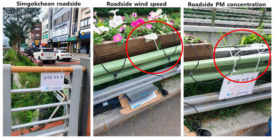 Based on the ultrafine dust removal efficiency results for the filter specimen examined in this lab experiment, it investigated the possibility of ACF filter application at an actual site. If natural wind occurs at the roadside, the ACF can function as an effective nonpowered filter that may be washed with water, making it an effective solution in terms of cost and environmental impact. We selected Simgokcheon, Korea (an ecological river restoration site) as the study area, wherein continuous natural wind is maintained. Wind speed was measured at a height of about 1m from the road in order to check the airflow generated by the contact between the car wheel and the road on the road. A road runs alongside the river, creating an ideal location for installation of the nonpowered filter. To confirm the suitability of the study site, we measured wind speed in the presence and absence of road traffic (Figure 4), and found that the average wind speed during traffic was 0.6 m/s (maximum = 3.47 m/s). Therefore, the test specimen was suitable for application at the study site.