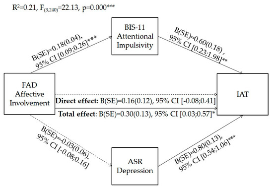 Finally, based on previous results, we verified whether impulsivity and depression mediate the effect of affective involvement perceived in the families of young adults and the score on IAT. As can be seen in Figure 1, the results of parallel mediation analyses showed that, initially, the total effect of Affective Involvement on youth IA was significant. However, considering the effects of mediators, the direct effect was reduced to a nonsignificant level. The direct effect of Affective Involvement on Attentional Impulsivity was also significant, but on Depression, it was not. The direct effects of mediating variables on IAT were also significant. Moreover, it was found that the model showed overall significant levels and explained 22% of the variance in IA.