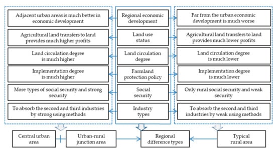 Based on the distance from the city center, the geographical location of farmers can be divided into urban villages, rural areas near the urban areas, and remote rural areas. From the perspective of spatial location, the regional differences can be divided into a central urban area, urban–rural junction area, and typical rural area. In the process of urban–rural integration, there are differences in regional economic development, land use status [], land circulation degree [], cultivated land protection policies [], social security [], and industry types in different spatial locations [] (Figure 1). These differences may be the key drivers of the external environment of cultivated land protection ecological compensation under different conditions.