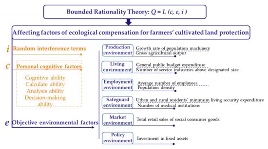 Cultivated land is the absolute foundation of human beings’ survival today and in the future and, as such, it must be protected from conversion into built-up environments and fragmentation. With the largest population in the world and rapid urbanization, China has a particular need to protect its cultivated land []. Since the start of the reforms and openness policy in 1978, the urbanization of China has been accompanied by a series of large-scale land use changes []. Meanwhile, there are stark differences between urban and rural areas in China [,,,]. From the perspective of geographical location, farmers can be divided into urban villages, rural areas near the urban areas, and remote rural areas. Based on the BRT, the willingness of farmers to undertake cultivated land protection is affected by the external environment []. The yield of cultivated land is closely related to the factors agricultural production environment. The improvement of agricultural production environment contributes to the increase of cultivated land yield. However, the regional agricultural production environment depends on the cultivated land protection policy environment []. To the farmers, the degree of protection for cultivated land is influenced by the different factors of the living environments. In addition, the employment environment affects the number of farmers working in agriculture. Furthermore, in China, cultivated land serves as both a means of production and as social insurance for farmers. The agricultural subsidy and ecological compensation for cultivated land can directly increase farmers’ income and consumption level []. The representative variables were analyzed in this study. The variables affecting ecological compensation for farmers’ cultivated land protection were defined from the perspective of the agricultural production environment, farmers’ living environment, farmers’ employment environment, farmers’ safeguarding environment, the market environment, and policy environment of the ecological compensation for cultivated land protection (Figure 2).