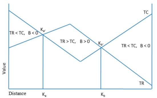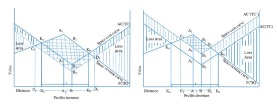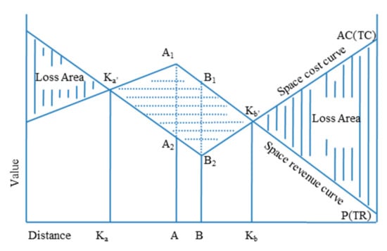 In Figure 3, A1 refers to the highest point of the Space revenue curve P (TR) and B2 refers to the lowest point of the Space cost curve P (TC). A1A2 refers to the profit value of the A location, and B1B2 is the profit value of the B location. Ka and Kb are two points where space cost and space revenue are equal in geospatial location [,,]. In the KaKb geographic interval, the P (TR) is greater than the space cost curve AC (TC). Therefore, the irregular quadrilateral Ka’B2Kb’A1 is the profit zone, and Ka and Kb are the geographical boundaries of the profit.