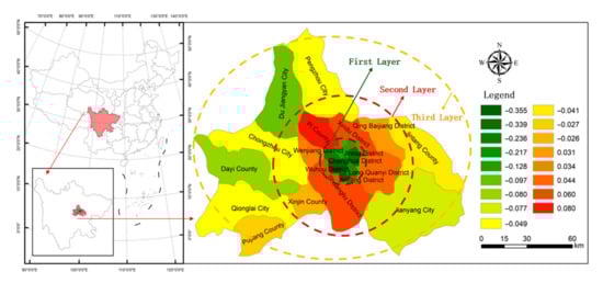 Precise and applied data resources are the foundation of the comprehensive benefit of the external environment of ecological compensation for cultivated land protection. In this study, the descriptive statistical data were taken from the Chengdu Statistical Yearbook 2017 []. The ArcGIS software and Microsoft Excel Software were used to deal with the data. The steps of data processing can be described as follows. The first step deals with data standardization. To eliminate the dimensional effect and the variations in the numerical value of the variable itself. The second step calculates the values of entropy weighting. Step three calculates the values of the comprehensive benefit of external environment of ecological compensation for cultivated land protection. In step four, the Kriging Interpolation Method was used to spatialize the data.
