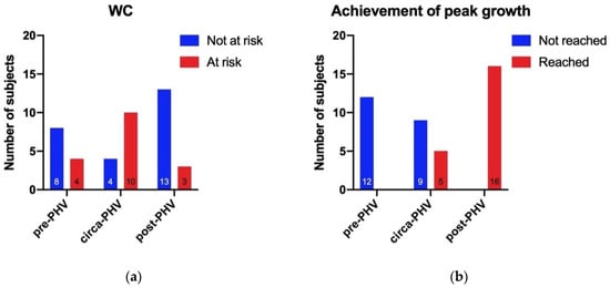 An association between maturity status and WC categories (2 = 8.956, p = 0.011) was seen (Figure 1a). The circa-PHV group showed the highest number of subjects with a WC >90th percentile and thus was considered at risk regarding this factor (i.e., 10 subjects, representing 71.43% of the circa-PHV group). In the pre-PHV group, 4 subjects (33.33%) were considered at risk, and in the post-PHV, 3 goalkeepers (18.75%) were in the same condition. Taking into account the entire sample of goalkeepers, 17 of them (40.48% of the total) had a WC >90th percentile, while 25 (59.52% of the total) had a normal WC.