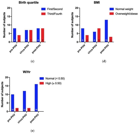 BMI and W/Hr data did not meet the required criteria to run the 2 test (Figure 1d,e respectively). However, in the pre-PHV group, 4 subjects (33.33%) were overweight/obese, while in the circa-PHV group, 8 subjects (57.14%), and in the post-PHV group 3 (18.75%) subjects were overweight/obese as well. Overall, on the 42 participants, 15 (35.71% of the total) were in overweight/obese condition, and 27 (64.29% of the total) were normal weight.